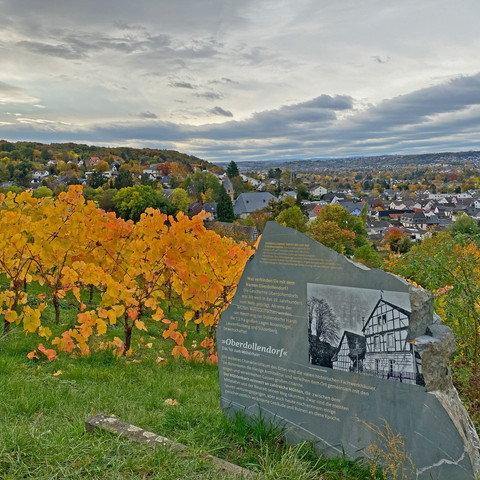 Heute ist die Anbaufläche in Oberdollendorf, namentlich Rosenhügel, Laurentiusberg und Sülzenberg auf etwas über 7 ha geschrumpft und wird von einem Winzer, der Familie Blöser in der Bachstraße, betrieben. Wir nehmen den Wanderweg, am neuen Teich vorbei, in Richtung Dollendorfer Hardt und durchqueren den hohen Mischwald, umrunden auf dem südlichen Waldweg die Hardt und kommen zur Hülle, dem Aussichtspunkt oberhalb der Weinlage. Mit dem Weinlehrpfad durchwandern wir die Rebanlagen und kommen zum Gut Sülz, dem ehemaligen Freihof des Klosters und steigen durch das Mühlental, in dem es ehemals 18 Mühlen gab, auf. Nachdem wir, am Friedhof vorbei, die Streuobstwiesen erreicht haben, erfreuen wir uns am schönen Weg, den Früchten im Herbst und der schönen Aussicht zur Oberkasseler Wand. Nach der Bebauung wandern wir durch ehemalige Weinberge, was wir an den Maueranlagen mit Treppenstufen und der eingelassenen Bronzetafel erkennen können. Nahe Haus Heisterberg wurde der Kellerberger Weinberg wieder angelegt und zeigt die alte Weinbautradition mit Ramhölzern.