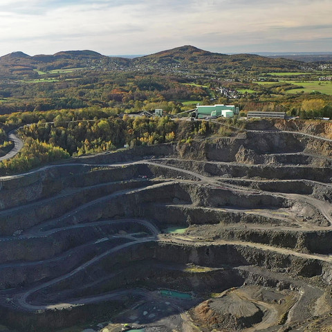 Mitten im Oberhau, fast schon als Wahrzeichen für den Basaltabbau, steht der grünlich gestrichene, weithin sichtbare, Brecherturm der RPBL (Rheinische Provinzial-Basalt- und Lavawerke GmbH & Co. oHG, Sinzig) am Rande des Basaltsteinwerkes Hühnerberg. Wenn Magma durch dünne Schlote fast unverändert schnell nach oben steigt und an der Erdoberfläche erstarrt, entsteht ein sehr feinkörniges Gestein, ein Vulkanit, hier im Hühnerberg Basalt. Basalt wird hauptsächlich für den Straßenbau, als Schotter für Eisenbahnstrecken und als Zuschlagstoff z.B. bei der Betonherstellung verwendet. Als Schmelzbasalt wird das Gestein zum Auskleiden für Anlagenteile benutzt, die starkem Abrieb ausgesetzt sind. Wie auf dem nebenstehenden Luftbild zu sehen ist, hat der Abbau den Hühnerberg ausgehölt und frisst sich inzwischen 90 Meter tief in die Erde. War der Berg mal 362 Meter hoch, liegt die Hangkante heute bei 289 Metern, inzwischen sind also 163 Meter Basalt abgebaut. Der Betrieb wird so noch einige Jahrzehnte fortgesetzt werden. Mit Sprengungen wird das Basaltgestein in sechs Fördersohlen mit einer Höhe von 30 Metern gelöst, gereinigt und dann in verschiedene Körnungen gebrochen. Dies geht bis hin zum Basaltsand, der als Filtersand oder zur Bodenverbesserung genutzt wird.