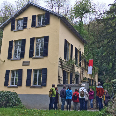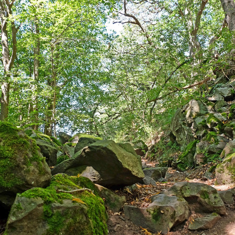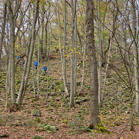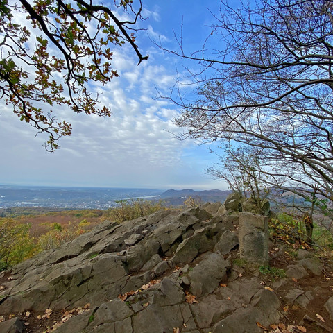 Die Aussicht vom Leyberg auf das Rheintal, das nördliche und östliche Siebengebirge, gehört zu den spektakulärsten des Siebengebirges. Der Aufstieg erfolgt auf den letzten 80 Metern über mehr oder weniger natürliche Felstreppen - Zeugen einer Basaltabbaugeschichte. Heute ist am Leyberg nur noch eine Trasse zu sehen, die am nördlichen Berghang schnurgerade durch den Wald läuft und auf Karten oder auf dem Luftbild gut zu erkennen ist. Diese Schneise ist ein Relikt aus der Zeit, als das Gestein aus den Steinbrüchen mit Hilfe von Bremsbahnen zu Tal gebracht wurde. Bremsbahnen hatten zwei parallel laufende Schienenstränge, auf denen Loren rollten. Die Loren waren so über ein Stahlseil verbunden, dass die vollen zu Tal fahrenden Loren die schon entleerten durch ihr Gewicht wieder hochzogen. Um den erheblichen Gewichtsunterschied zwischen vollen und leeren Loren auszugleichen, gab es einen Bremsapparat. Damit wurde die Ablaufgeschwindigkeit des Seils mechanisch reguliert, indem das Seil um mehrere Rollen lief. Der Bremsapparat wurde ganz in Eisen konstruiert und in die Erde eingemauert, in sogenannte Bremskeller.